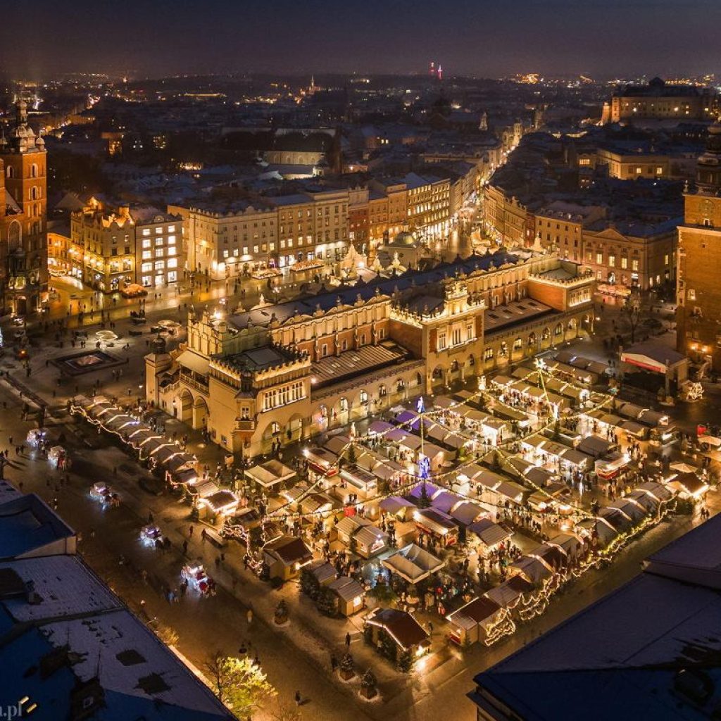 The Kraków Christmas Market takes place at the famous Main Market Square, which transforms into a magical festive village in December. Visitors can explore stalls featuring handmade ornaments, traditional dishes like oscypek (smoked cheese) and pierogi, and Galician mulled wine. The Kraków market also stands out for its artistic performances and carol concerts.