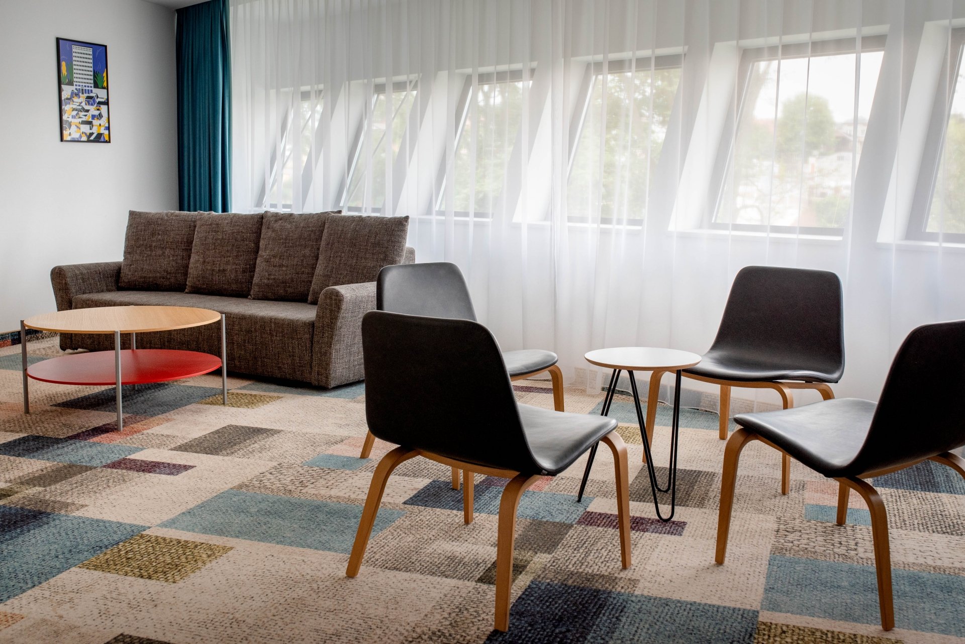 The living area can be easily transformed into a cozy setting for business meetings, combining functionality with sophistication.
