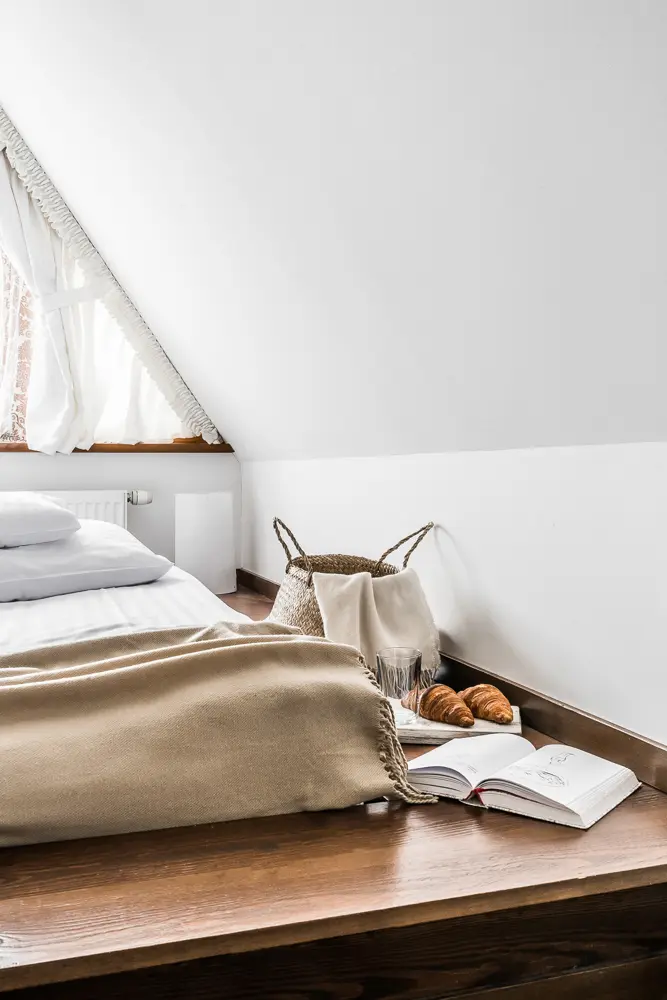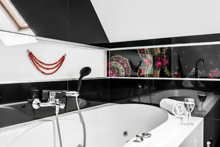 A bathroom adorned with jewel-like finishes, a stone column in the living room, and wooden beams beneath the ceiling—this apartment will captivate anyone seeking beauty, coziness, and comfort on their holiday. Imagine the moonlight streaming through the triangular window into a room softly lit by delicate lamps. The glow reflecting off wine glasses set for dinner, and the warmth of wooden floors underfoot. No deadlines, urgent calls, or noise—just soothing silence all around.