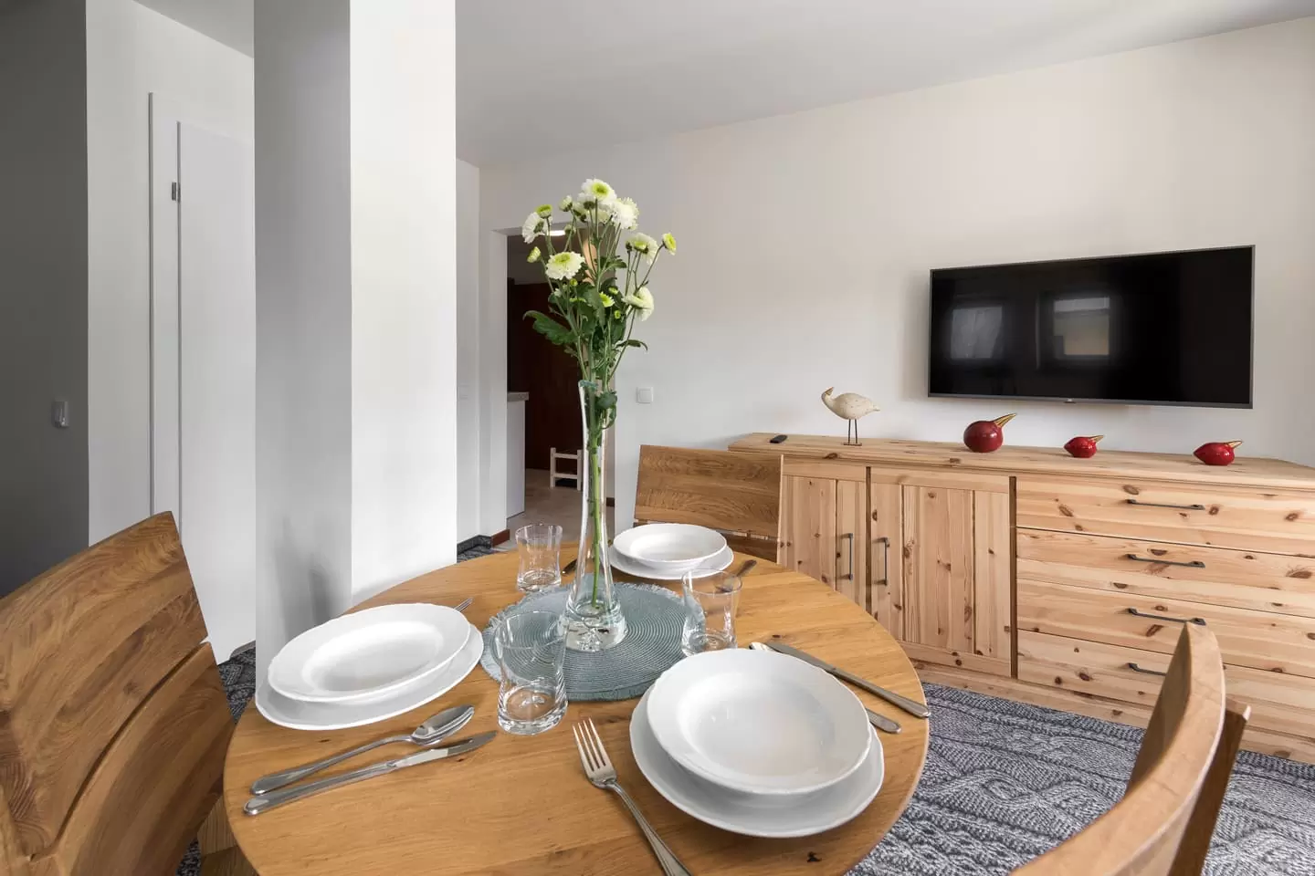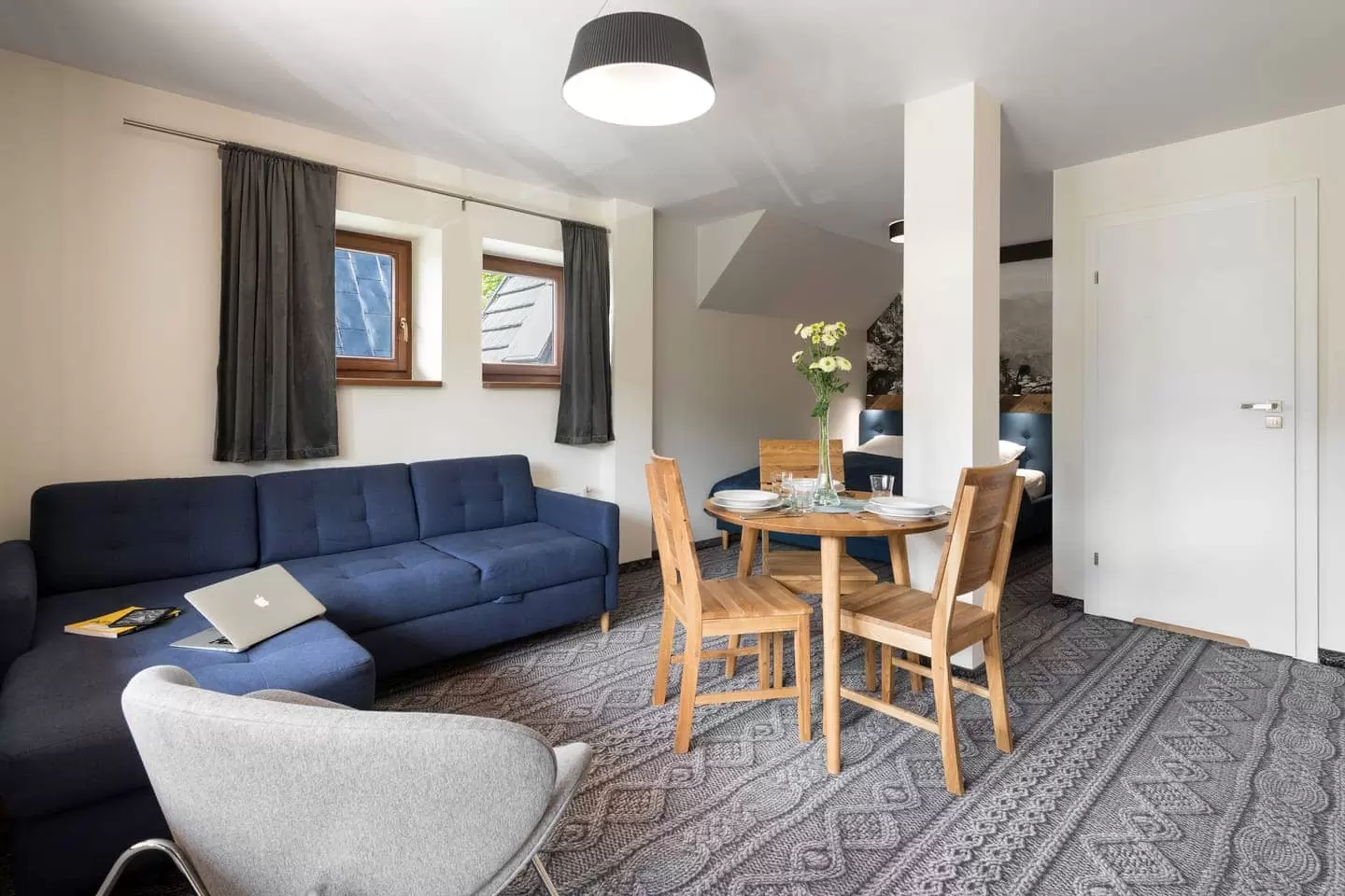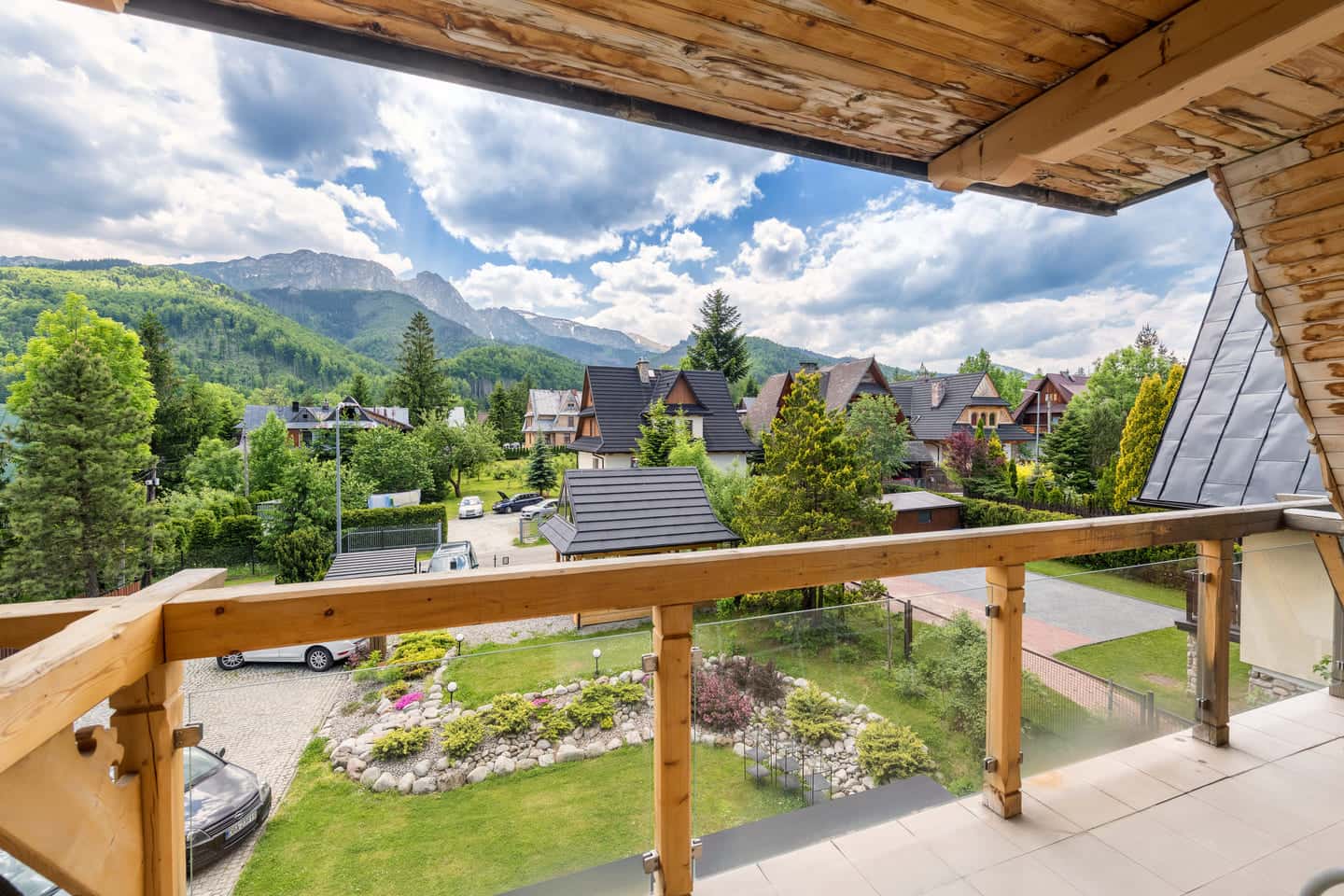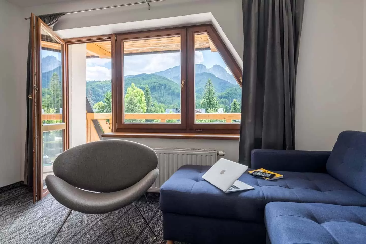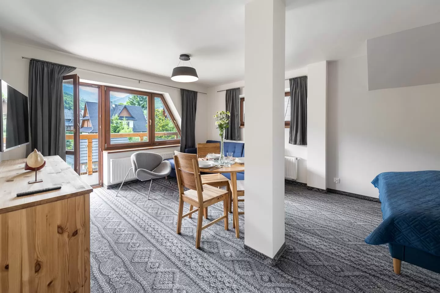 A studio apartment with a balcony offering stunning views of Giewont and Kasprowy Wierch.