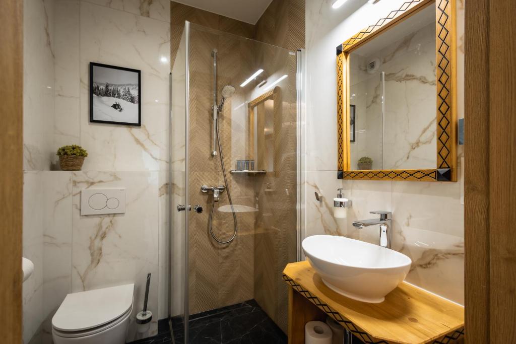 This apartment features a living room, a separate bedroom, and a bathroom with a shower and complimentary toiletries. The well-equipped kitchenette includes a stovetop, refrigerator, dishwasher, and kitchen utensils.