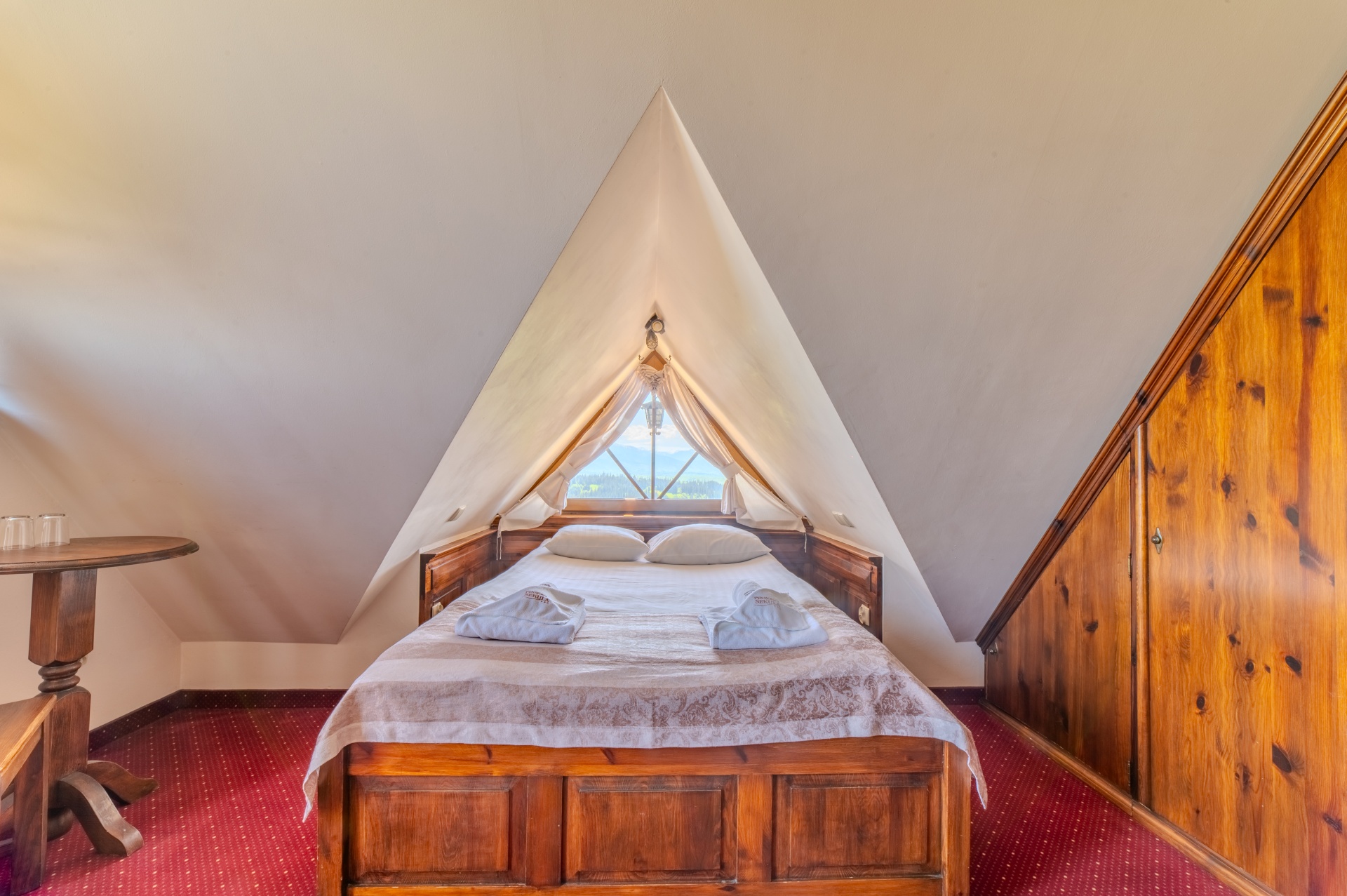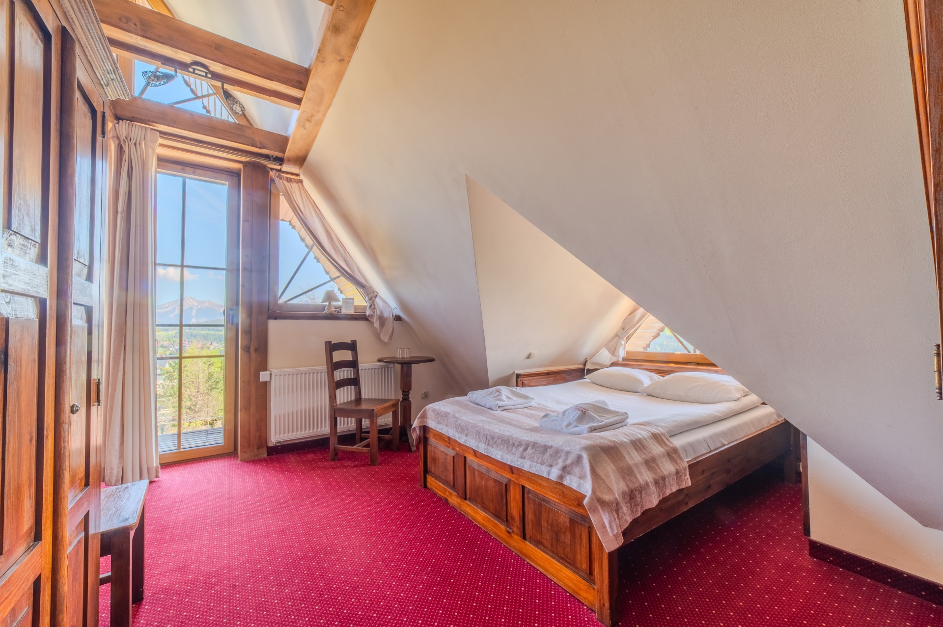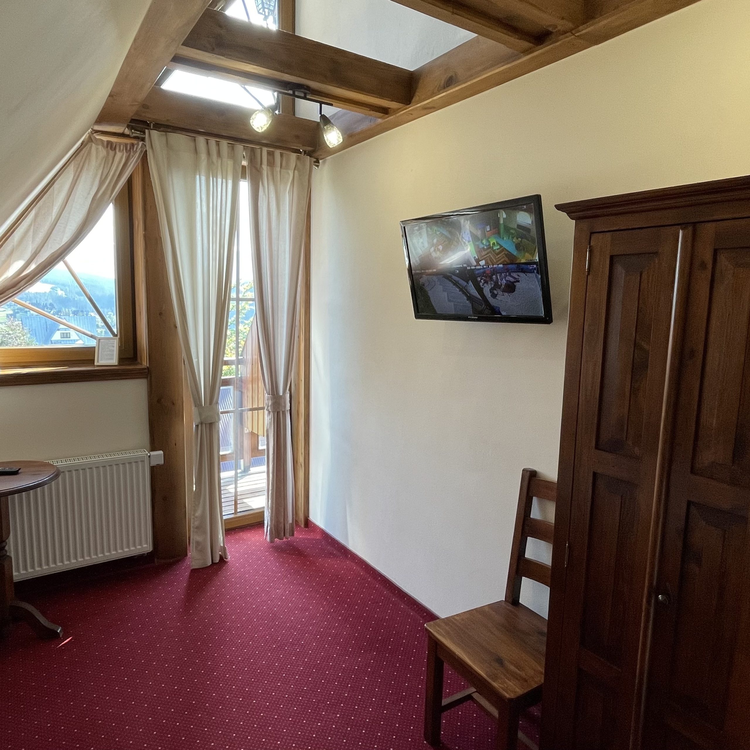A charming attic studio featuring sloped ceilings, a balcony, and stunning mountain views, perfect for a cozy and peaceful stay.