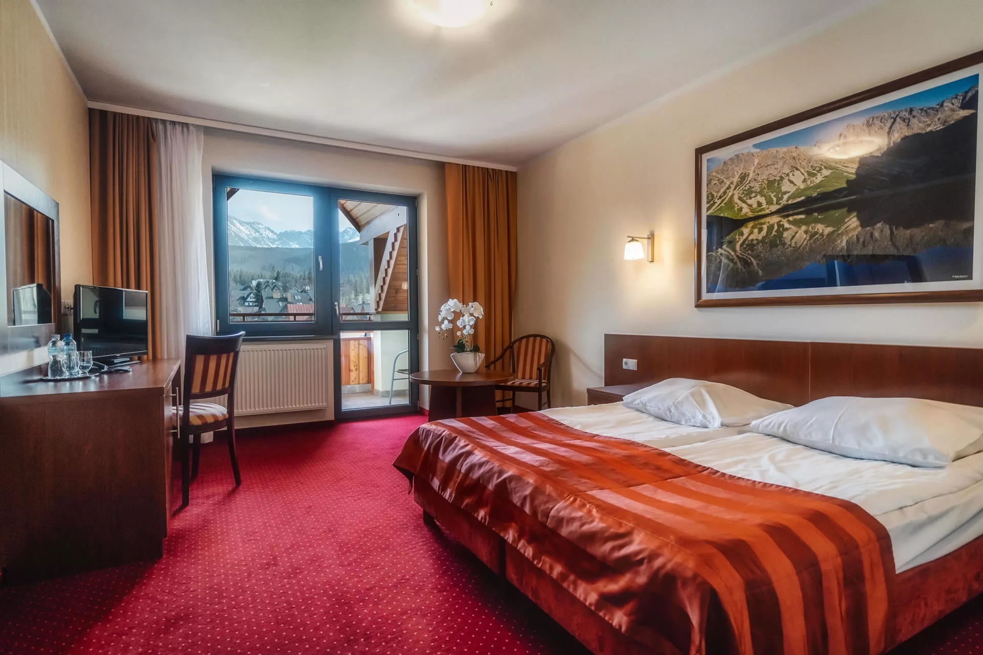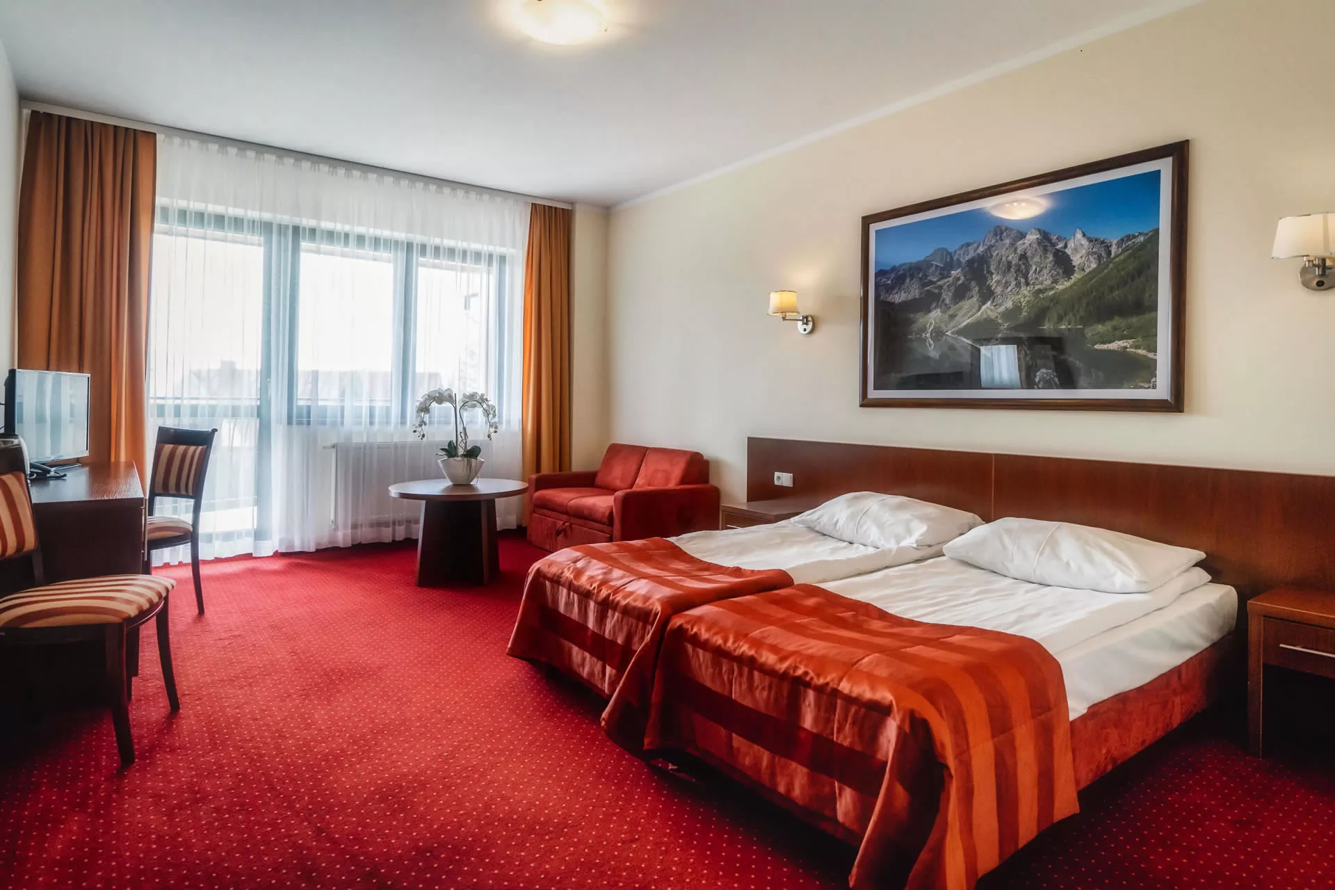 Family double rooms with balconies, perfect for couples. Modernly finished with a touch of highlander style. Spacious rooms of approximately 25 m², equipped with a kettle and a flat-screen TV.