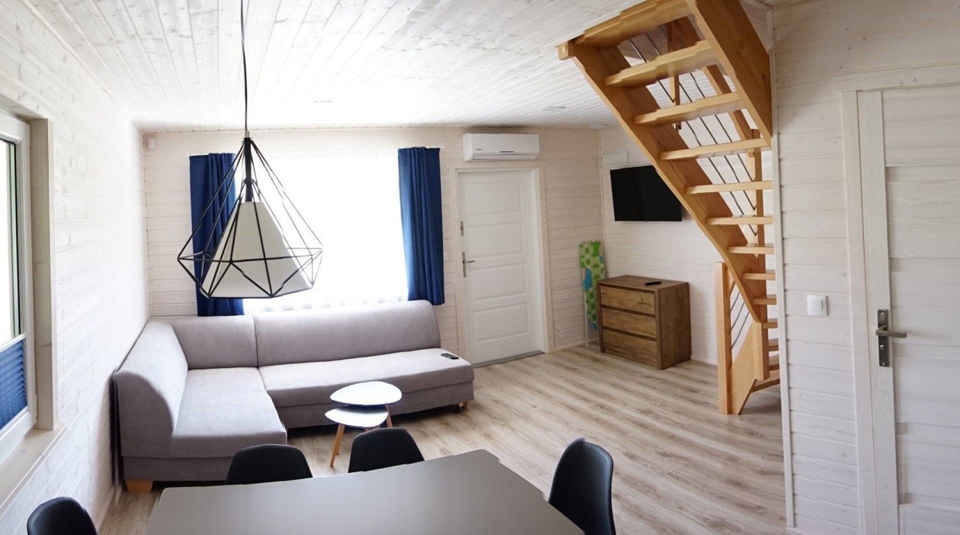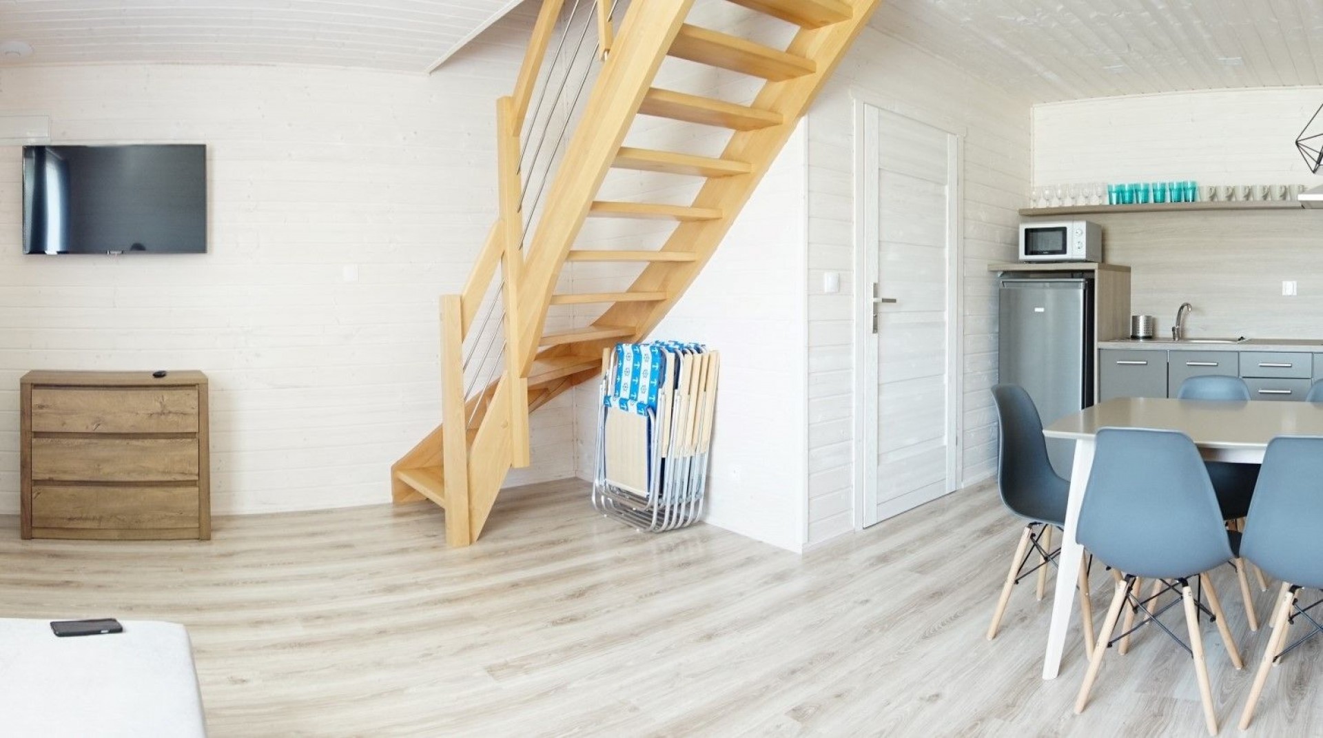 We offer modern, comfortable cottages with a kitchenette. On the ground floor, you’ll find a living room with a sofa bed, a kitchen, a restroom, and an outdoor terrace. The upper floor features two bedrooms—one with a double bed and balcony, and the other with two single beds. Each cottage is equipped with air conditioning, a TV, six sun loungers, and a beach windscreen.