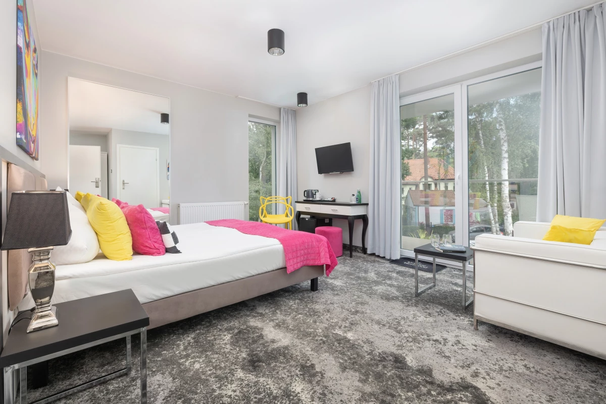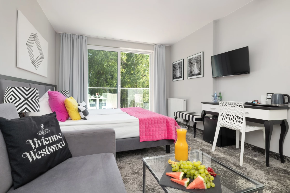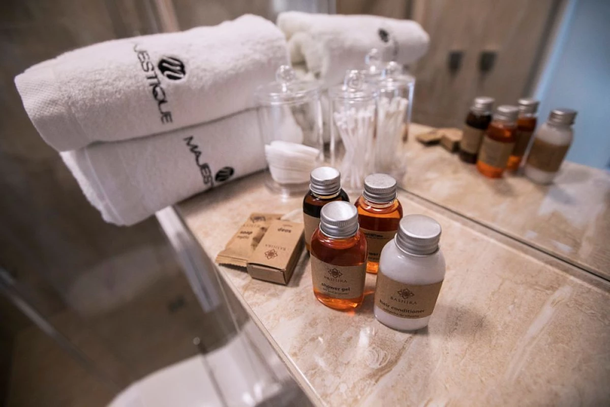 Each room is equipped with a minibar fridge, a stylish vanity with a mirror, and a welcome set / kettle, coffee, tea, mineral water /, an LCD Smart TV with a selection of cable and satellite channels, and complimentary Wi-Fi. The bathrooms come with towels, hairdryers, and free toiletry kits. Additionally, for our guests in each room, there is beach gear awaiting: a blanket, windbreak, umbrella, sun loungers, and in the garden, comfortable soft loungers and hammocks for blissful rest and relaxation. On the ground floor, there’s a reading nook filled with books, tourist guides, and newspapers.