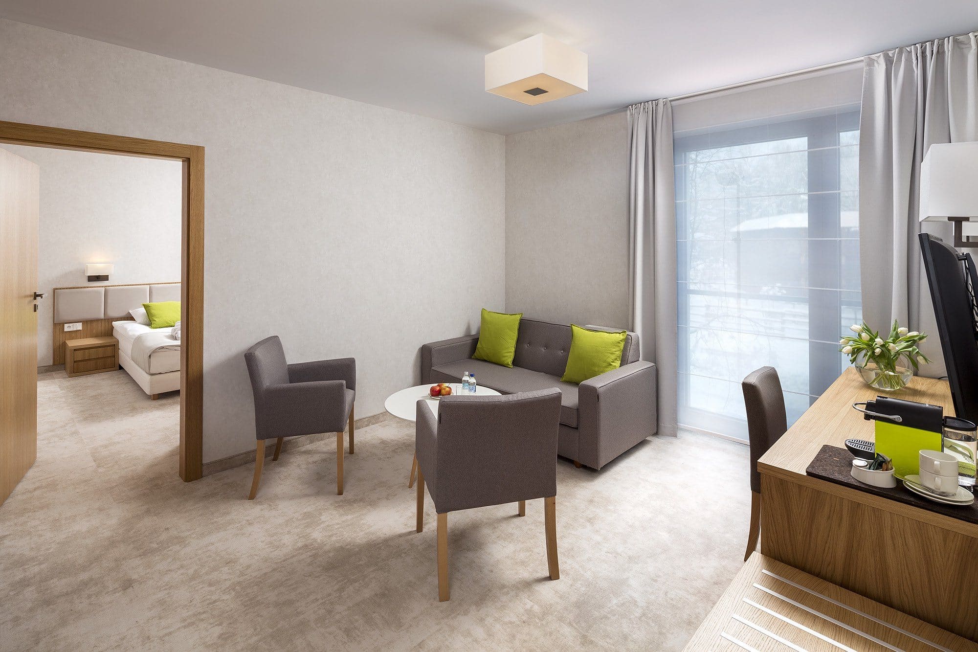 The interiors are designed in a modern, elegant style that ensures exceptional comfort. The warm, natural color palette harmonizes beautifully with the stunning surroundings of the Park Zdrojowy.