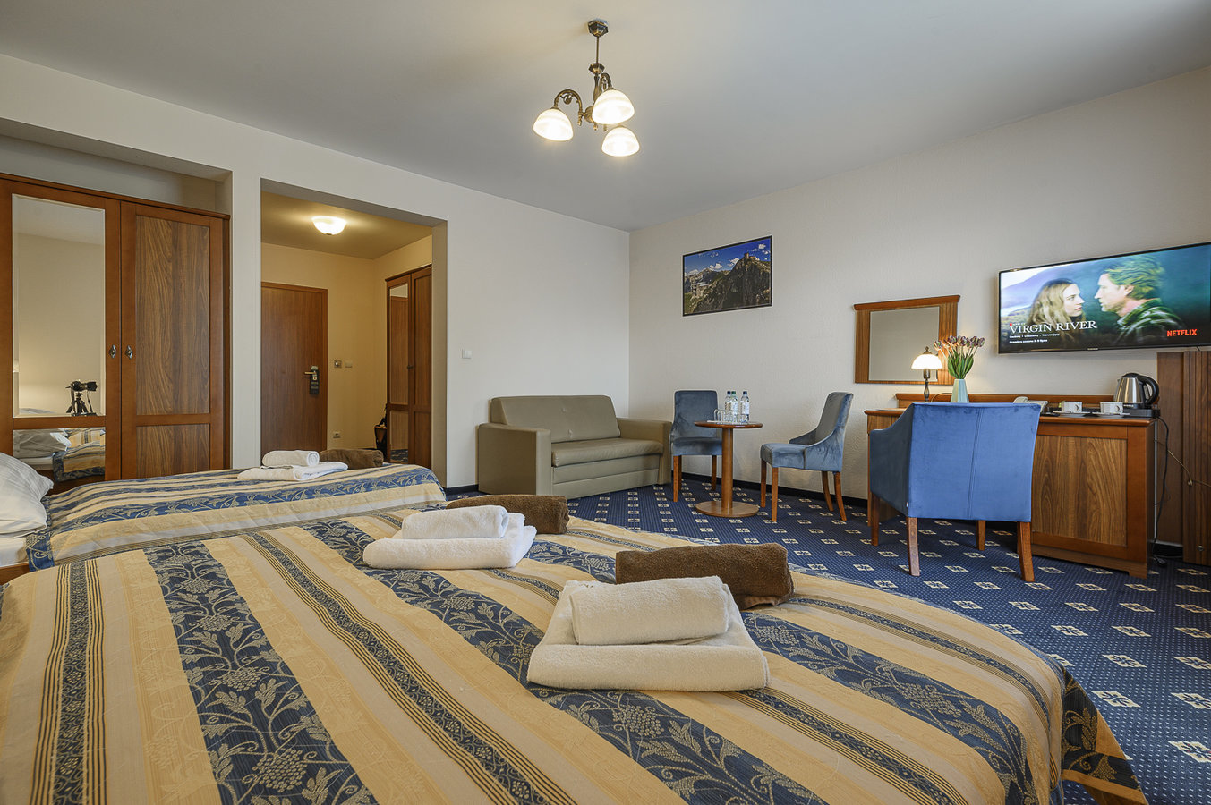 The spacious layout of these rooms allows for extra beds or fold-out sofas, making them perfect for families or groups. Hotel*** Liptakówka is fully adapted for guests with disabilities, ensuring accessibility and comfort for all.
