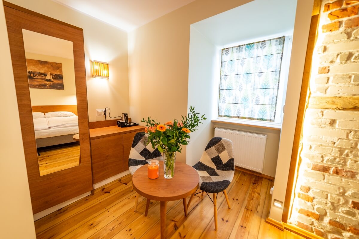Our local craft market is growing rapidly and the cooperation extends the common experience. All wooden doors are made by the Masurian company Deika, which has been on the market for 30 years. In addition, the rooms have lamps, kikniests, mirrors and shelves also made by the local Playwoodworks artisan. The furniture in the rooms was also manufactured by a company located in Masuria.