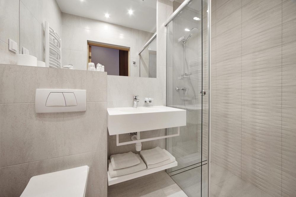 This comfortable and stylishly furnished double room features a balcony with stunning mountain views. It includes two single beds that can be joined together, as well as an additional child’s bed. Guests can enjoy a private bathroom with a shower.