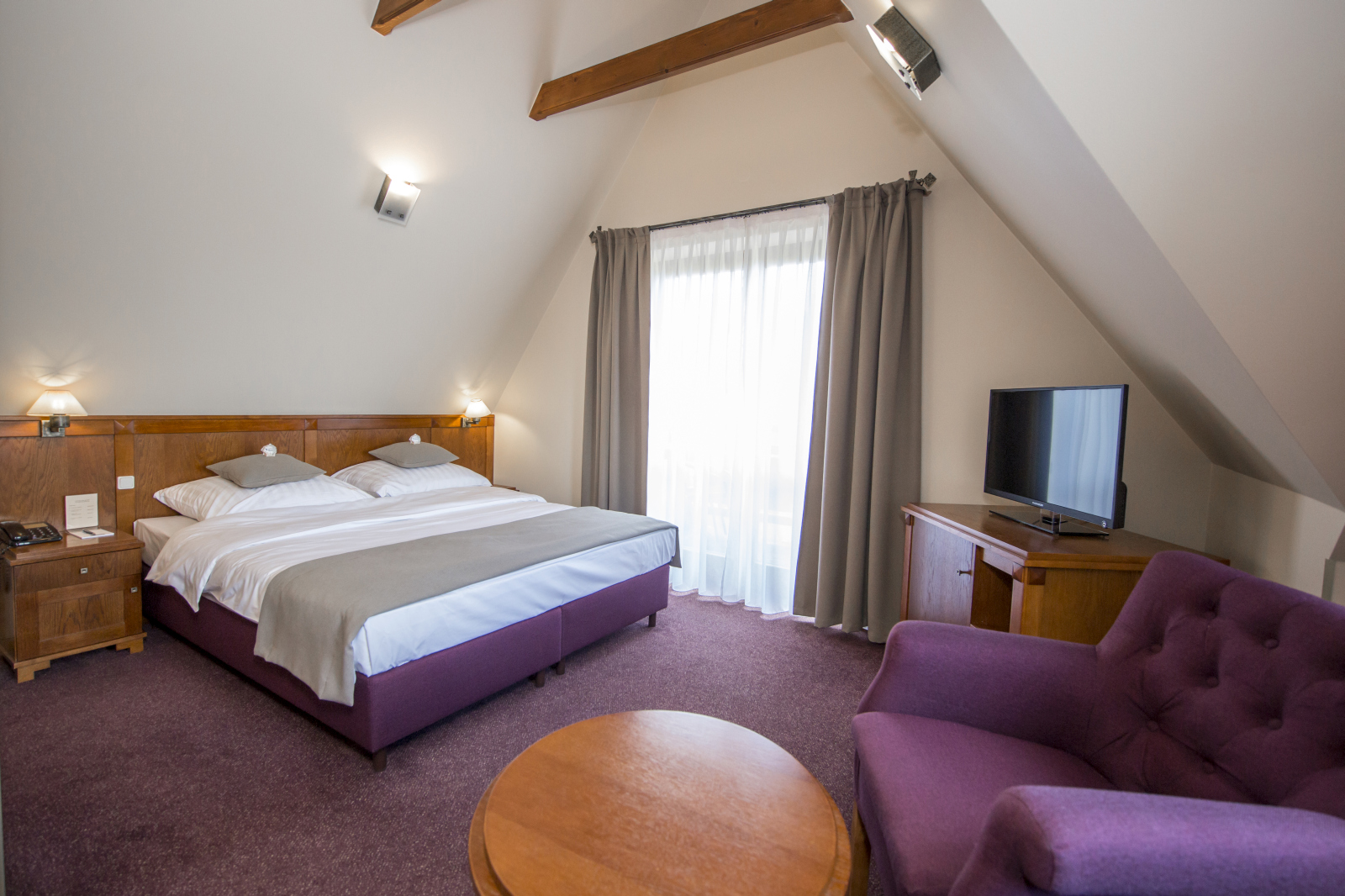 Double Room with a stunning view over the mountains is equipped with: air-conditioning, wide matrimonial bed, wooden furniture, safe box, mini-fridge, tea/coffee set, bathroom with shower and hair dryer. TV LED 32’ together with radio will make your stay more pleasant. All rooms of this type have balcony.