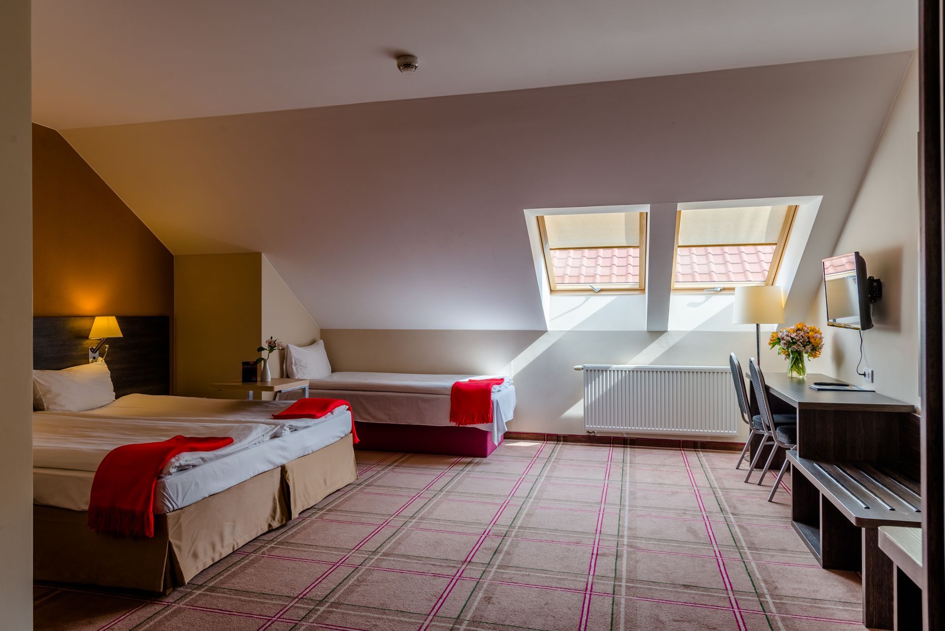 A spacious room decorated in warm, pastel colours with fast, free of charge Internet access. The room can accommodate a maximum of 2 adults + 1 child up to 4 years old without an extra bed, sleeping in the parents’ bed + 1 child up to 14 years old sleeping on a single bed. Room facilities: a modern, Scandinavian bed of Queen type (160x200cm) with and extra bed (90×200) with a comfortable pocket mattress, kettle and cups, large safe for 17” laptop, LCD TV, fridge with mineral water upon arrival, selection of additional, anti-allergic pillows, mobile, multifunctional table, electronic card locks; bathroom in a modern style with a shower, a large countertop, a dryer, a set of towels. On request: ironing set, wake-up service, laundry service, cots, baby baths, bottle warmers.