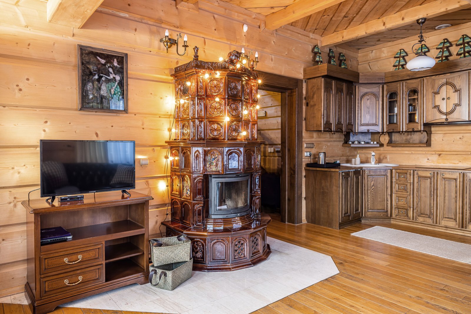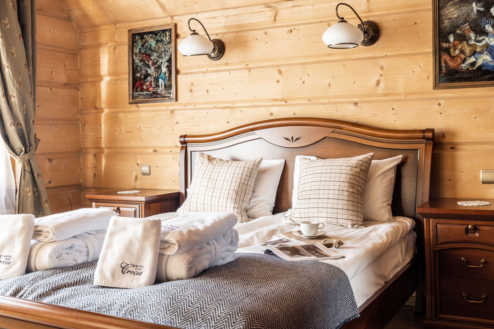 In its, colors, design and furnishings it refers to the highlander style. The warmth of the wooden interior, the charm of the regional furniture guarantees you perfect leisure. On the ground floor is located a comfortable sitting room, a kitchen and a double bedroom with a bathroom. On the first floor are located a bathroom, and two comfortable double bedrooms. In the lower level are located a banqueting hall, a kitchen, and a bathroom. The spacious porch is a great place for leisure on the summer nights, or on warm winter days. The guests of the cottage can use all the offers of the Hotel Crocus.