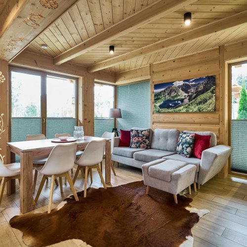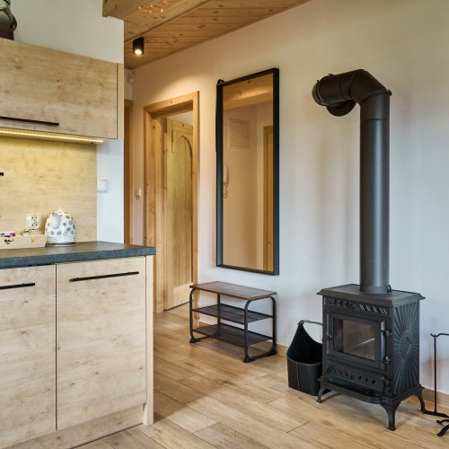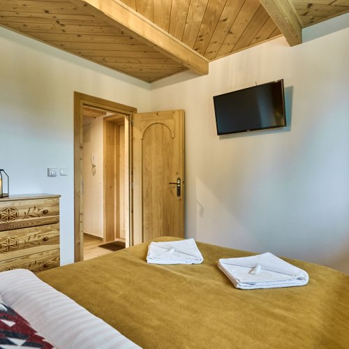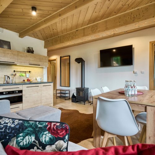 This apartment is loved by guests because of the great view. Modernity intertwines here with the traditional highland style. It is located on the second floor and has a balcony. Perfect for families or a group of friends. The apartment includes: living room with sofa bed, fireplace and TV fully equipped kitchenette two lockable bedrooms with double beds and TV bathroom with shower and heated floor Our guests are welcomed with tea, coffee and a bowl of sweets, and in the case of stays of at least 5 days, with a little surprise. We also offer a sauna, which we hope will make your stay more pleasant and allow for better regeneration before another trip to the mountains or before sporting challenges. There are 2 free parking spaces assigned to the apartment. Parking is video-surveilled. Apartment amenities: