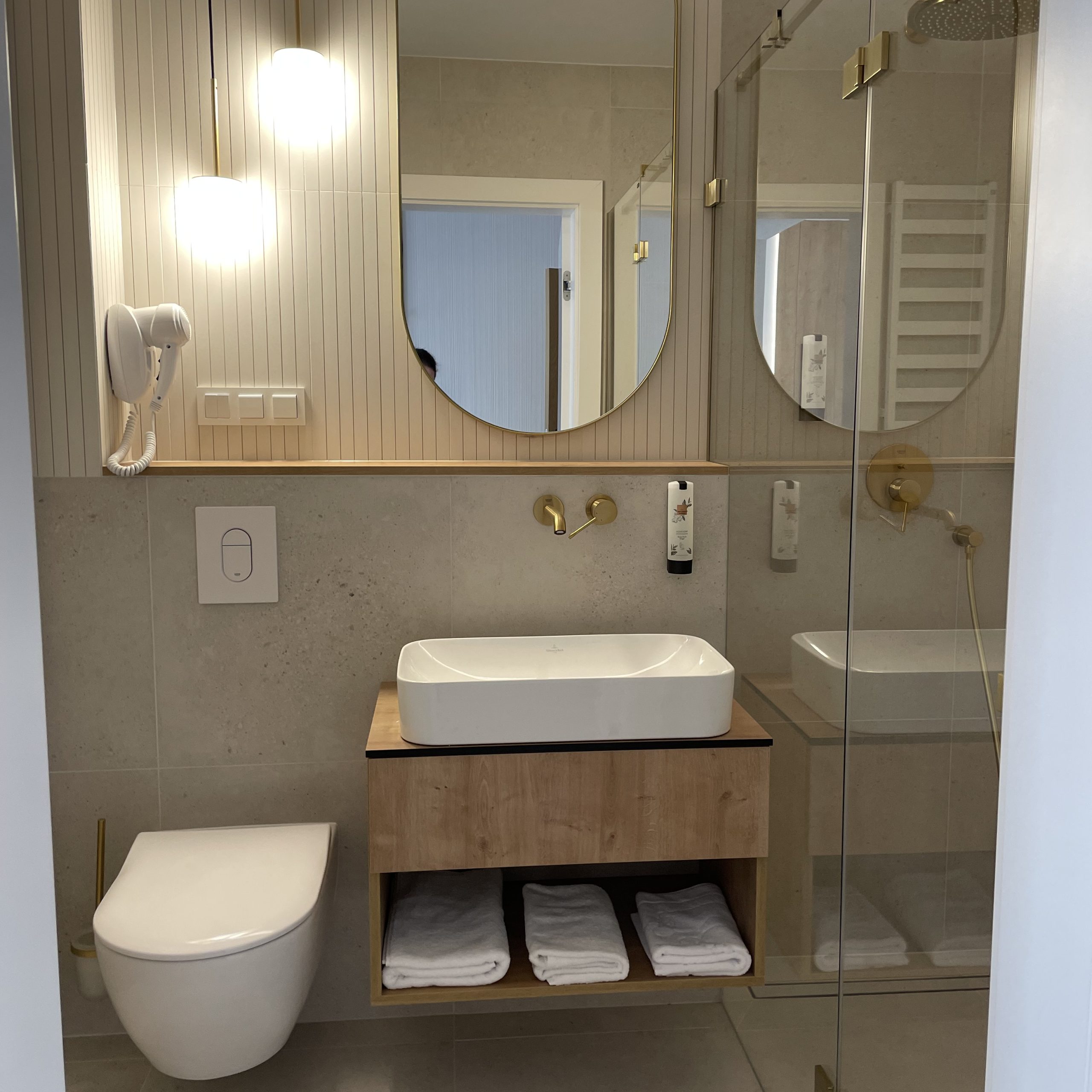 Additionally, the room features an LCD TV with access to terrestrial channels (Polish and German), a wardrobe, a desk, a telephone, and complimentary Wi-Fi. The en-suite bathroom is equipped with a shower cabin, a hairdryer, towels, a set of toiletries, and heated flooring for added comfort.