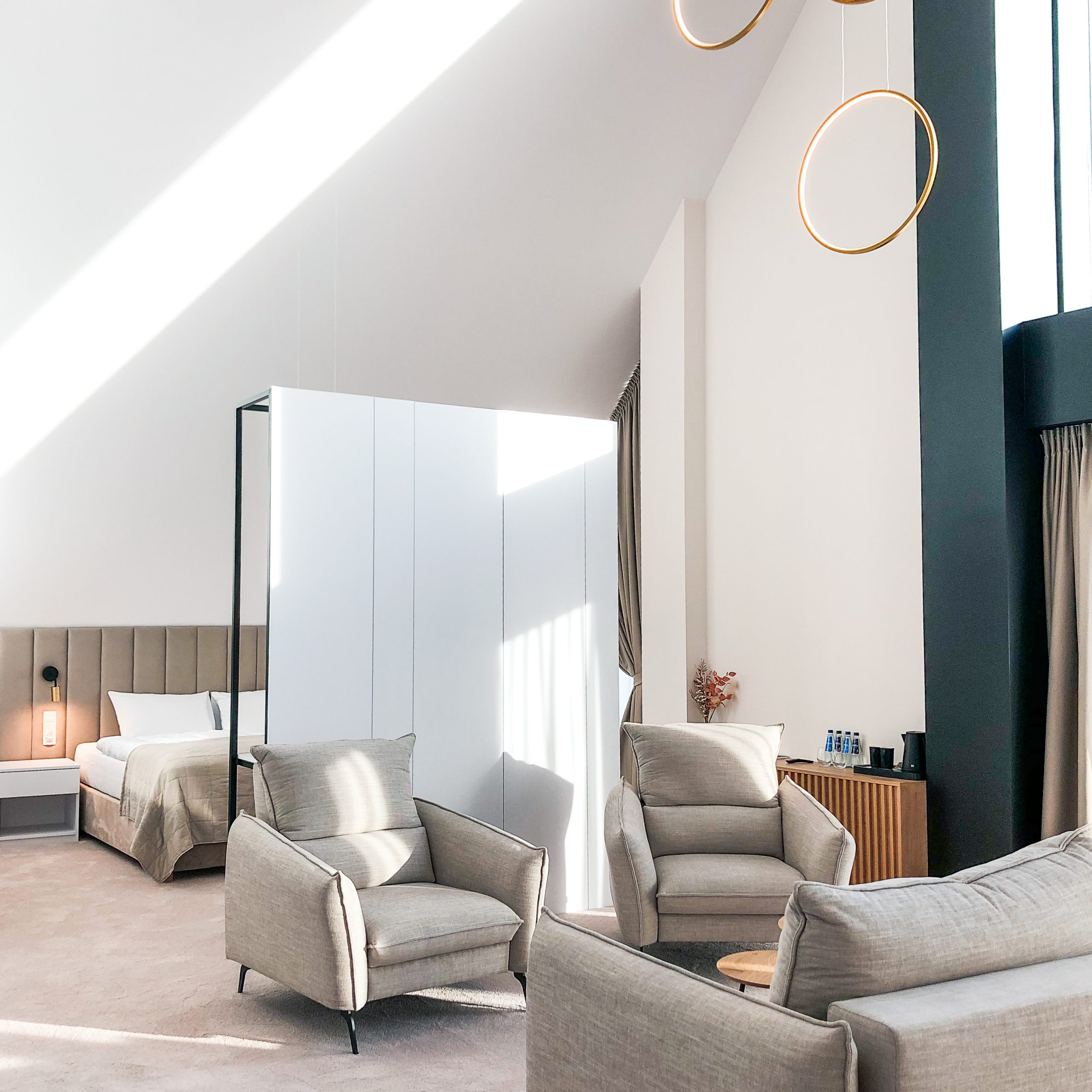 The Superior Room is a comfortable and modern double room with an option for an extra bed, offering an average area of 30 m². This room is furnished with a cozy king-size bed and a fold-out sofa, providing both space and convenience for your stay.