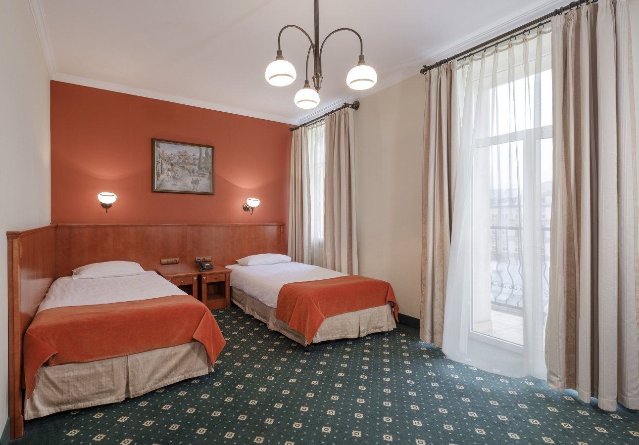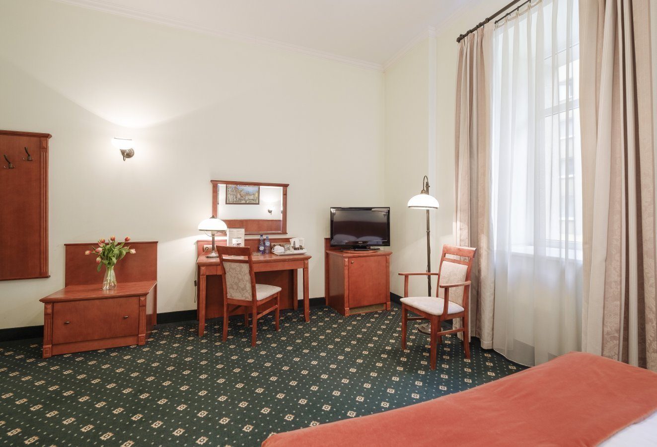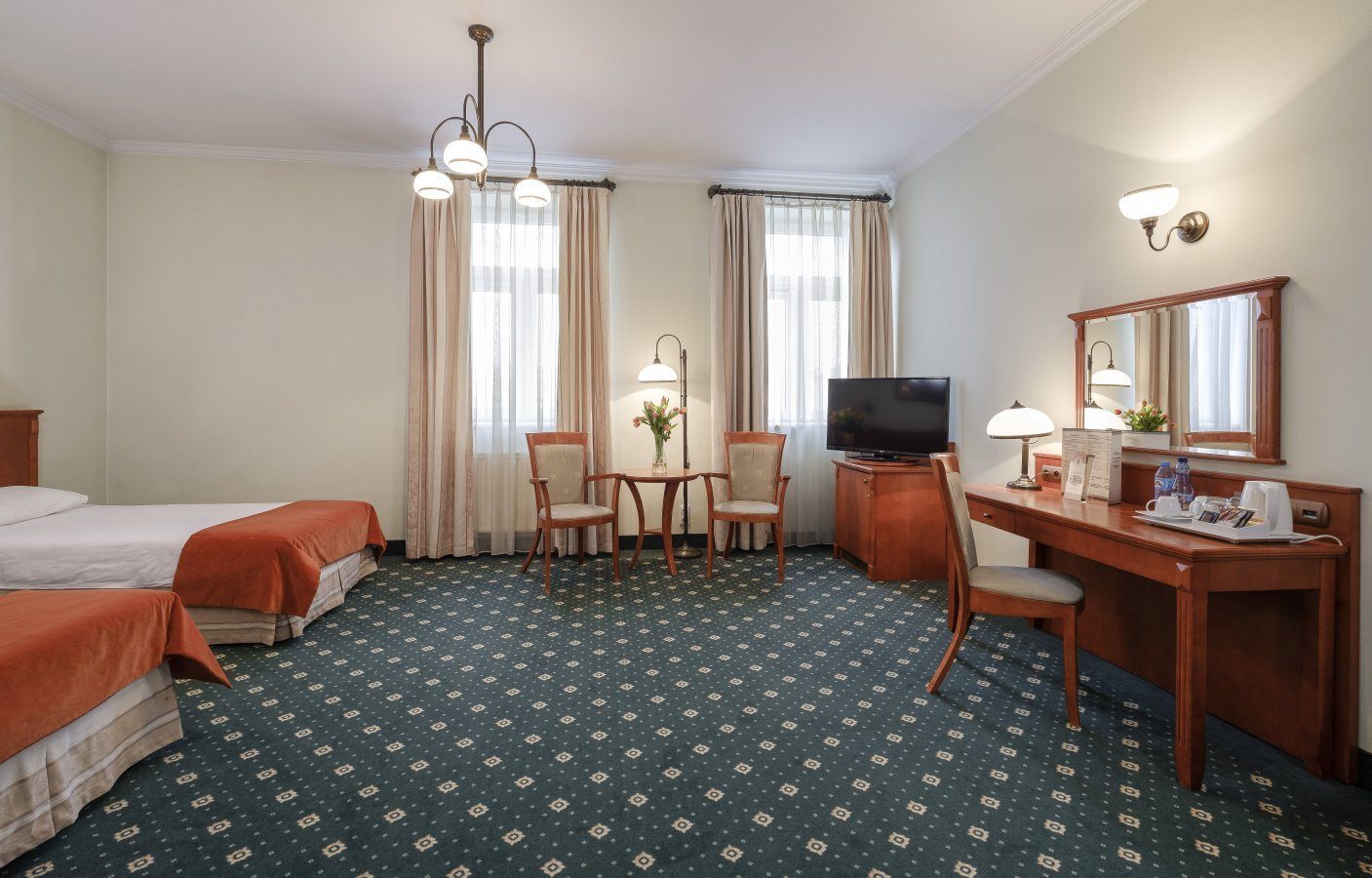 A classically furnished room equipped with air conditioning, a satellite TV, a refrigerator, and a tea and coffee-making set, ensuring a comfortable stay.