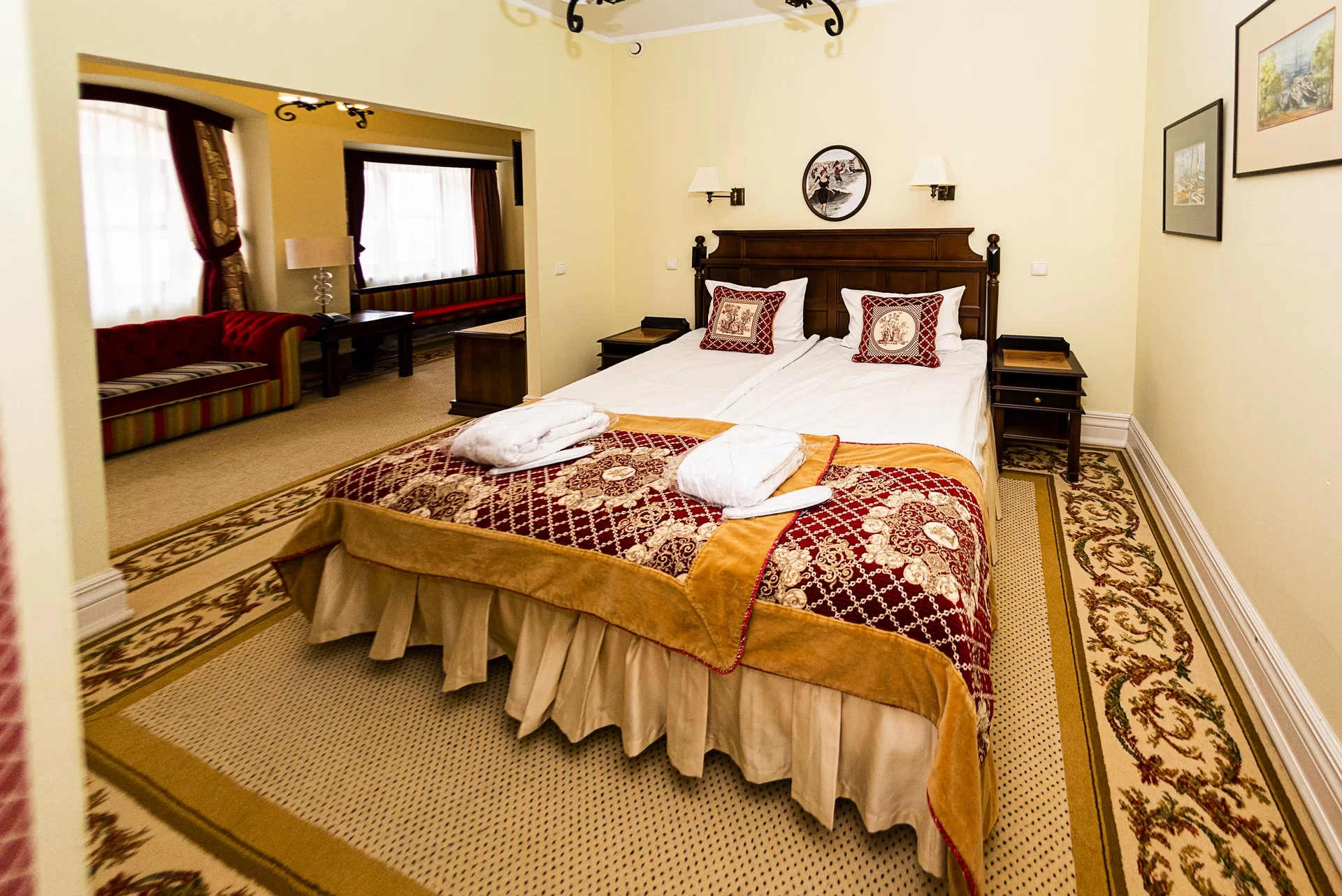 The castle ambiance is enhanced by beautifully stylized interiors. The hotel offers single and double rooms of the highest standard, as well as three-person apartments and studio rooms perfect for families or groups of friends. Designed to evoke the elegance of palace chambers, these boutique spaces promise a royal experience.