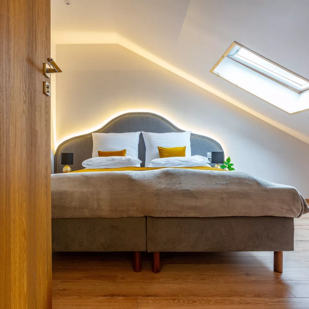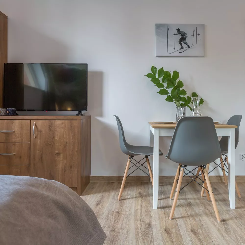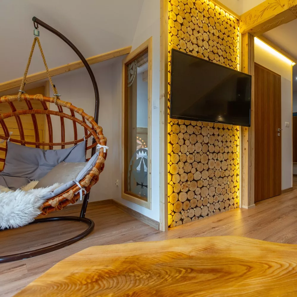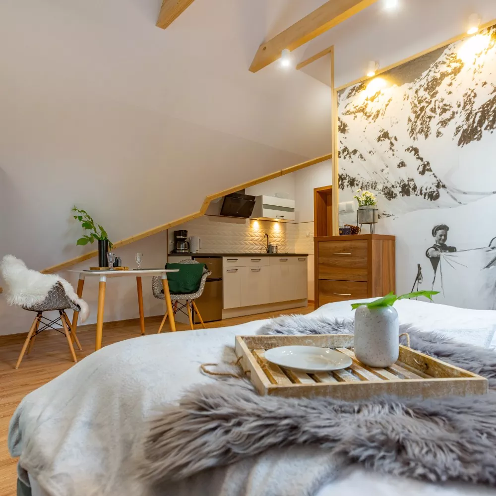 With a slightly industrial yet cozy loft-style design, the apartments feature a unique ambiance inspired by the history of Zakopane’s railway. Comfortably furnished, they also boast autumn and winter views of Giewont from the windows.