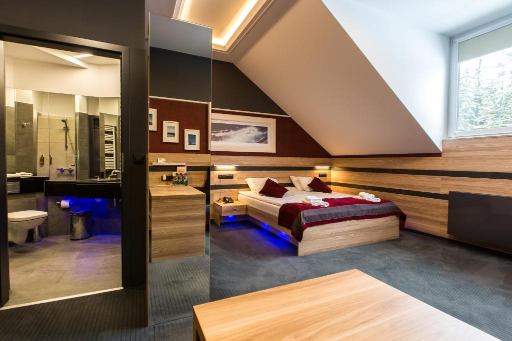 In our facility you can choose from 15 comfortable and spacious rooms furnished in modern style. In every room, there is space for 2 to max. 4 people. The sophisticated and state-of-the-art interiors of our guesthouse, the proximity of mountains, peace of the forest, whisper of water will guarantee that your stay at our venue will bring you rest in a completely new dimension. Also, there are fully-equipped kitchenettes at your disposal.