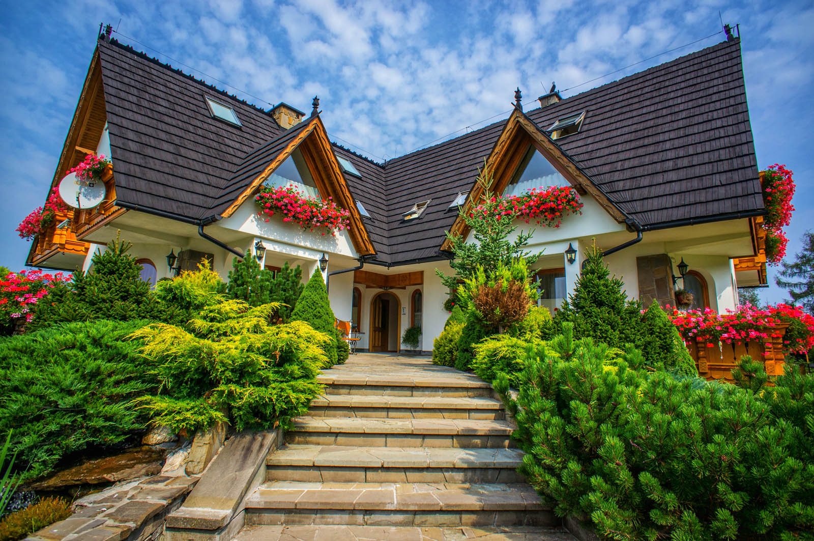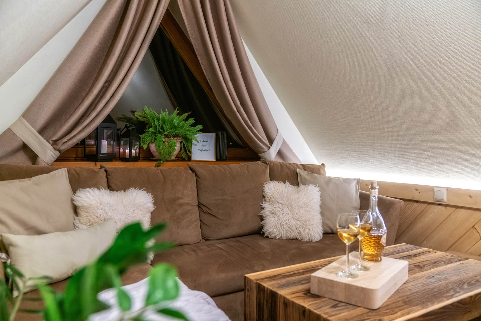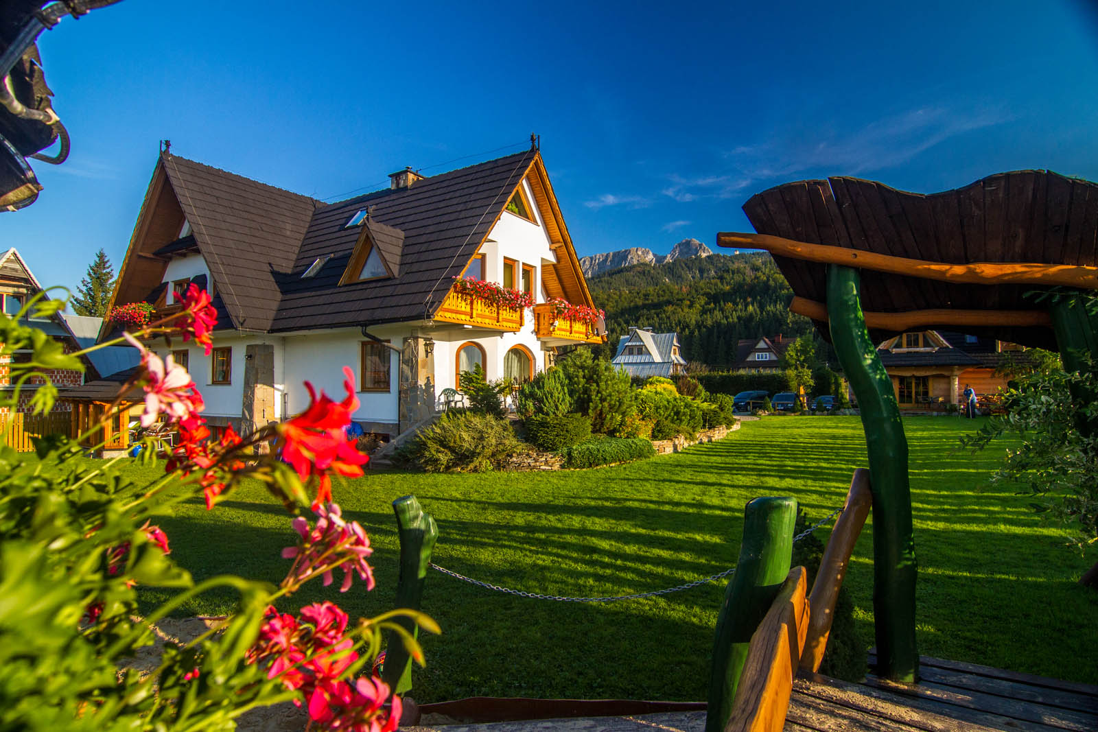 Our key advantage is our location and the variety of additional attractions we offer. Just 300 meters from the villa, you’ll find the entrance to the Mała Łąka Valley, as well as trails leading to Giewont and the Czerwone Wierchy peaks. The Pod Reglami path connects to other popular valleys, including Dolina za Bramką, Dolina Strążyska, and Dolina Kościeliska. On-site amenities include a Jacuzzi, sauna, billiards, and a cozy fireplace lounge. Outside, we provide a large garden with facilities for barbecues and bonfires. For our younger guests, we’ve created a playground featuring a Baba Yaga’s cottage, sandbox, trampoline, and swings.